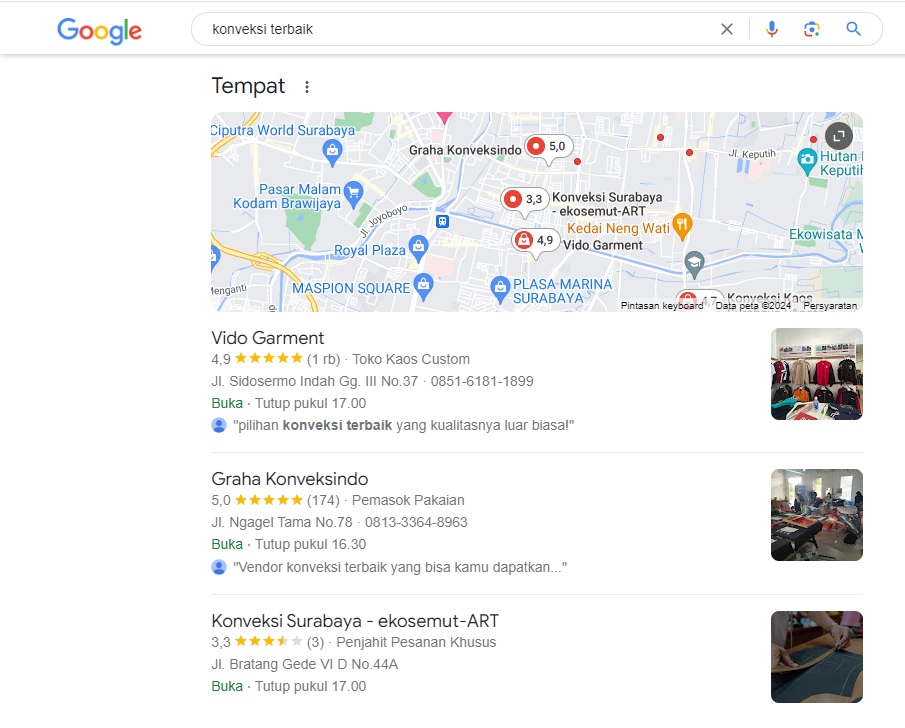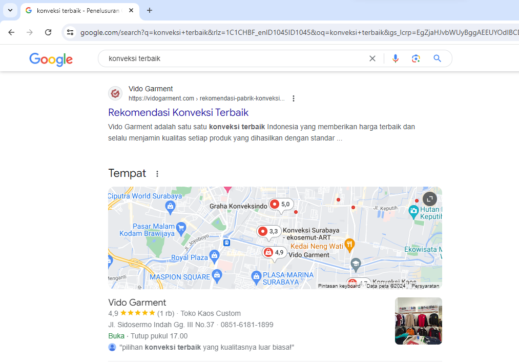 5. Dan satu lagi yang terakhir dan paling meyakinkan, Konveksi terbaik memiliki jejak digital yang baik, seperti memiliki Google Business dengan review terbanyak dan rating tertinggi, ini sudah termasuk social proof yang sangat meyakinkan, Anda bisa mencobanya dengan mengetik keyword “konveksi terbaik” dan bisa mengecek beberapa google business konveksi lainnya.